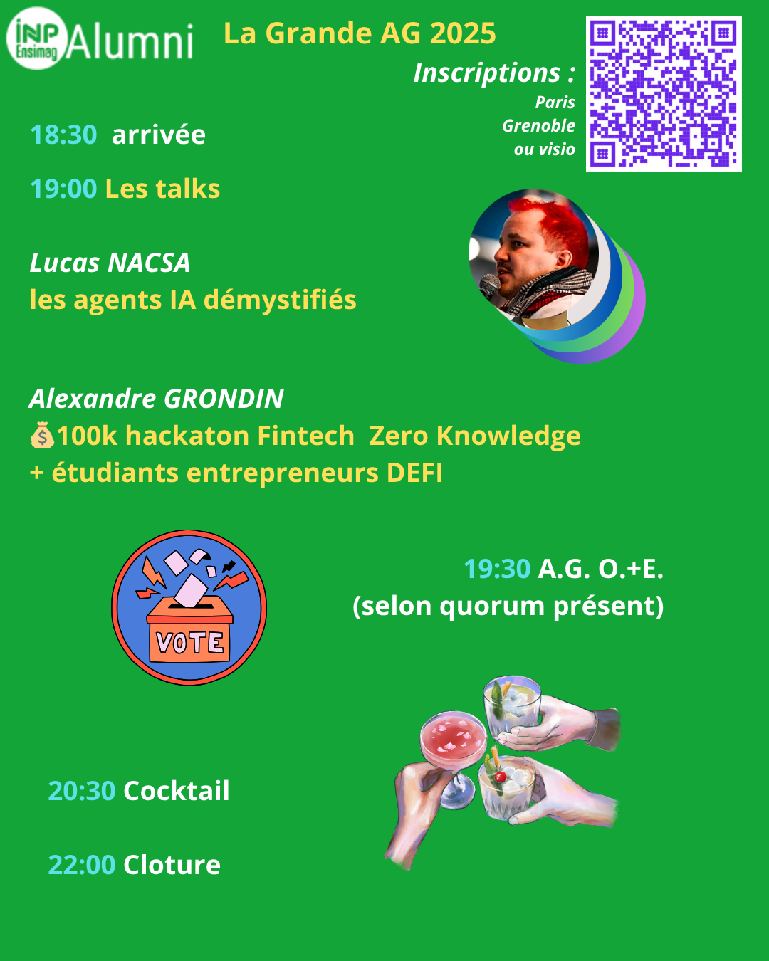 Nous nous réunissons mardi 14 octobre à 19h à Paris 8è (lieu envoyé aux inscrits), Grenoble (Espace co-working conférence Ensimag), et en visio pour l'Assemblée Générale (AG) annuelle de notre association accessible à tous nos élèves et diplômés Ensimag.